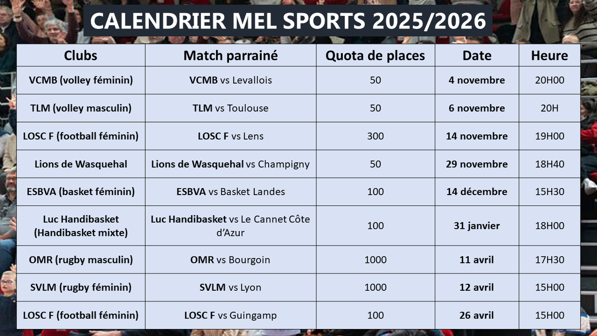 Vous trouverez ci-dessous le formulaire d’inscription pour assister aux différentes rencontres MEL SPORTS